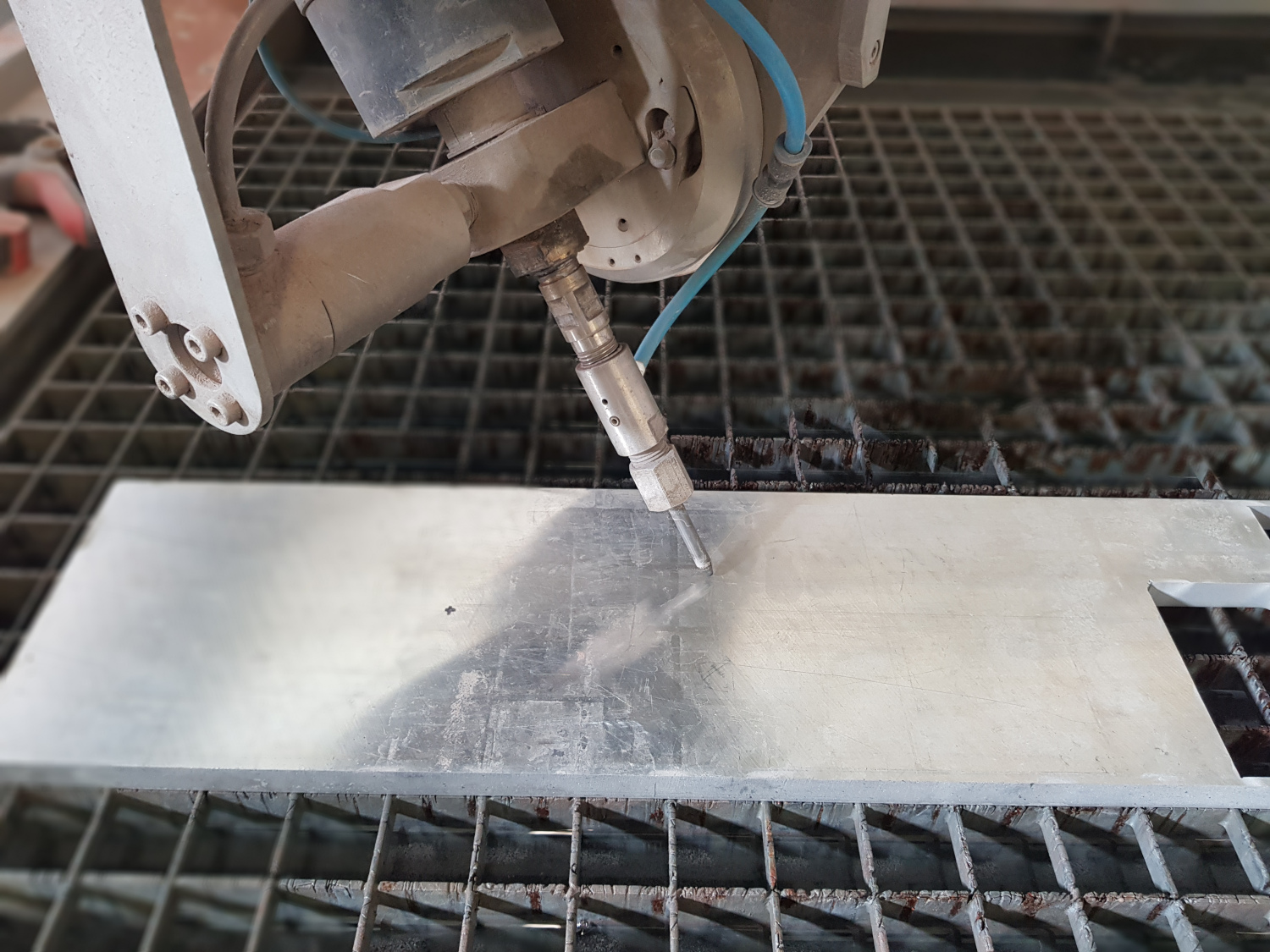 Der Wasserstrahl spielt seinen Trumpf auch bei Materialstärken aus, wo der Laserstrahl keine Chance mehr hat. 30 Millimeter Baustahl und mehr sind hier kein Problem.