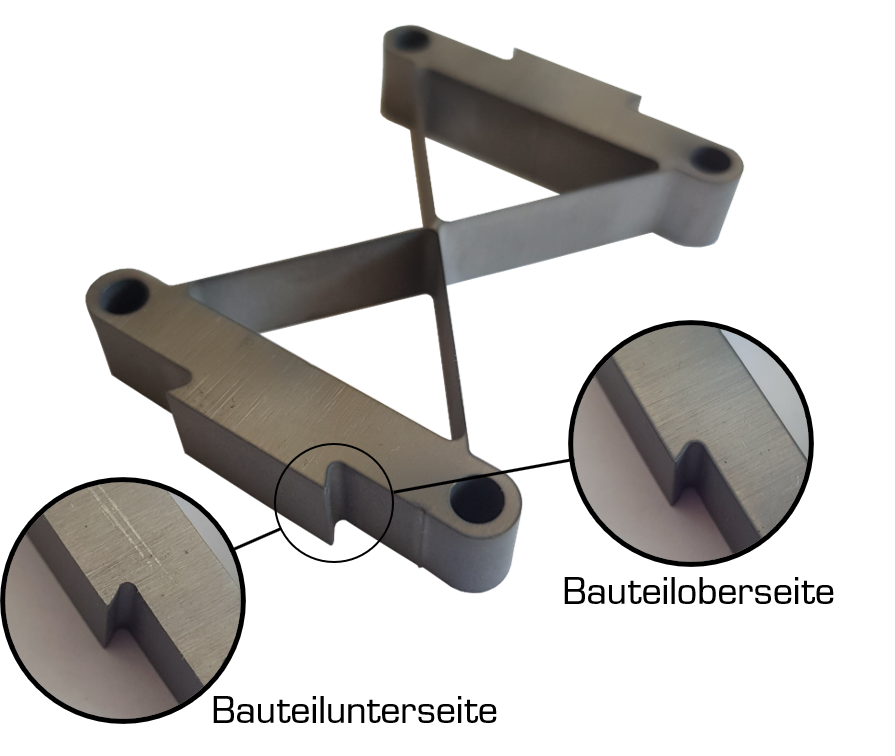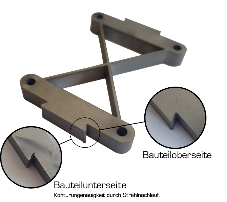 Bei großen Materialstärken oder harten Werkstoffen kann es zu Konturungenauigkeiten an der unteren Bauteilseite kommen. Grund hierfür ist der verfahrenstypische Strahlnachlauf. Diese Konturungenauigkeit kann auf Wunsch durch gezielte Beeinflussung der Bearbeitungsparameter minimiert oder sogar vollständig beseitigt werden.​